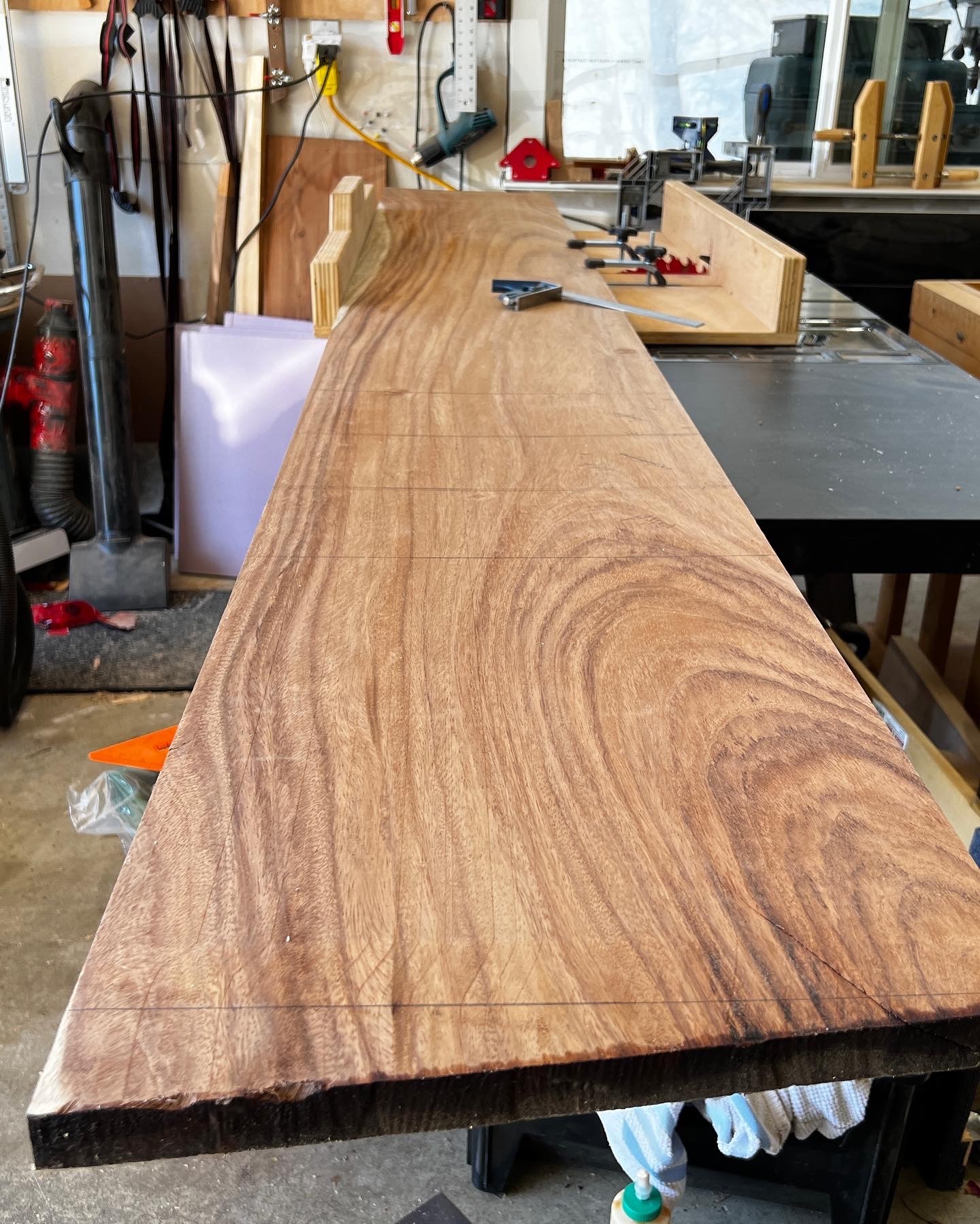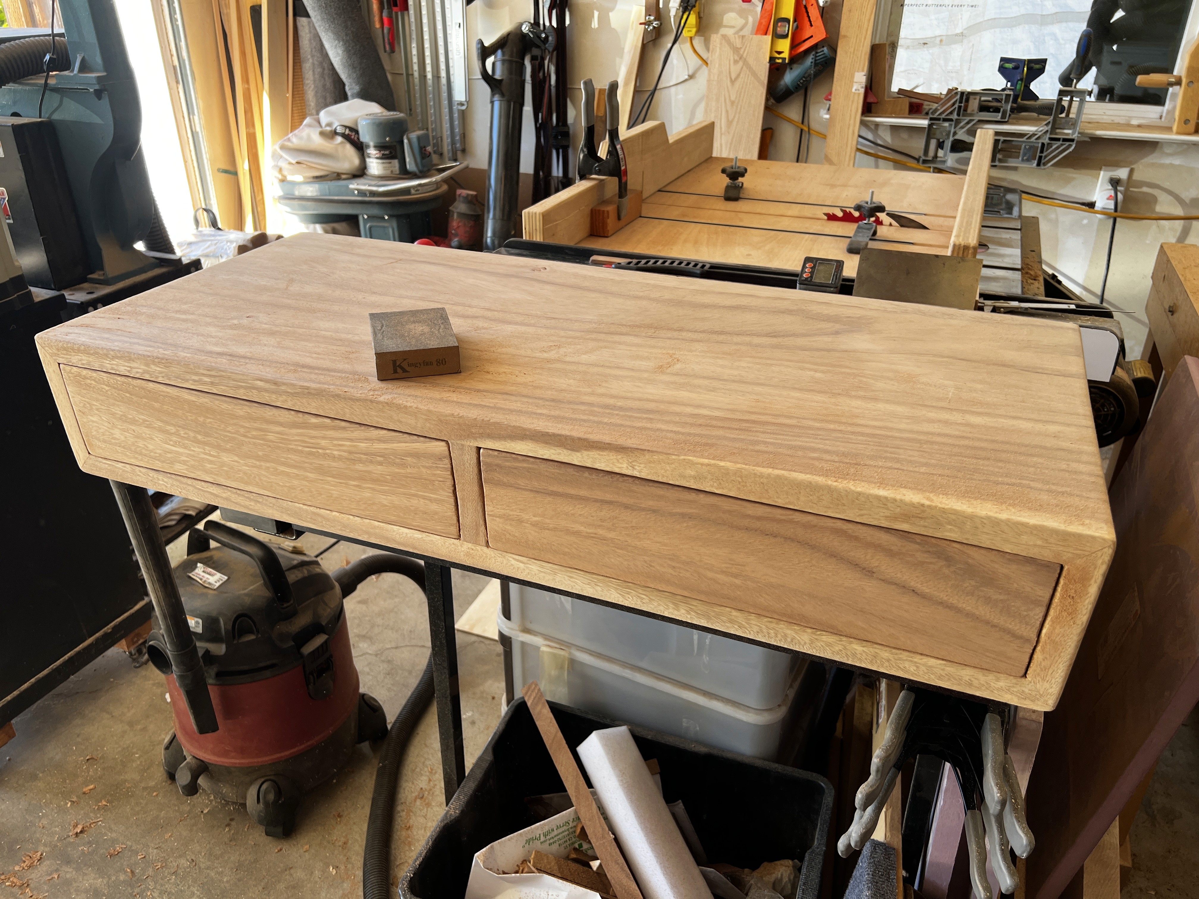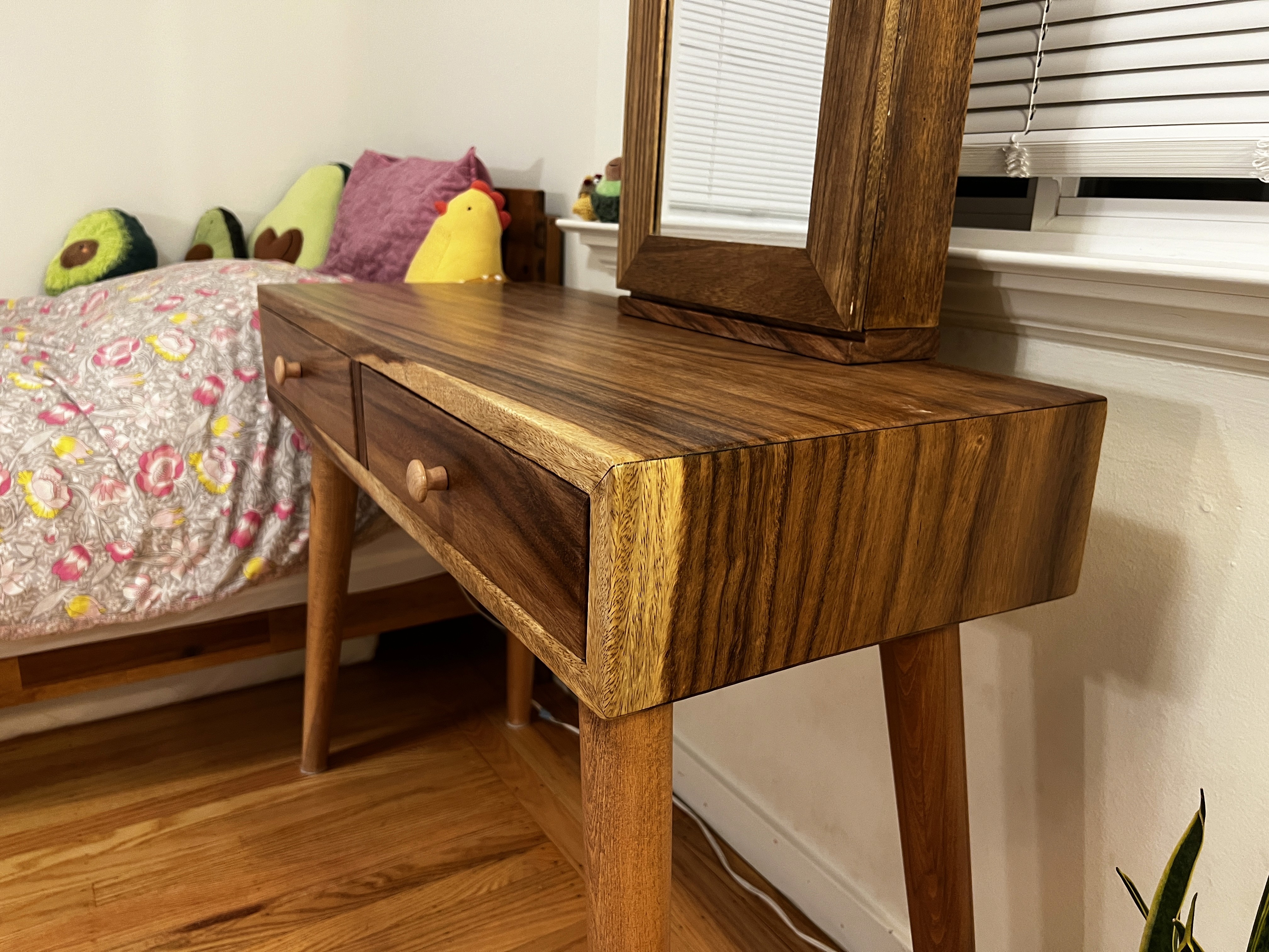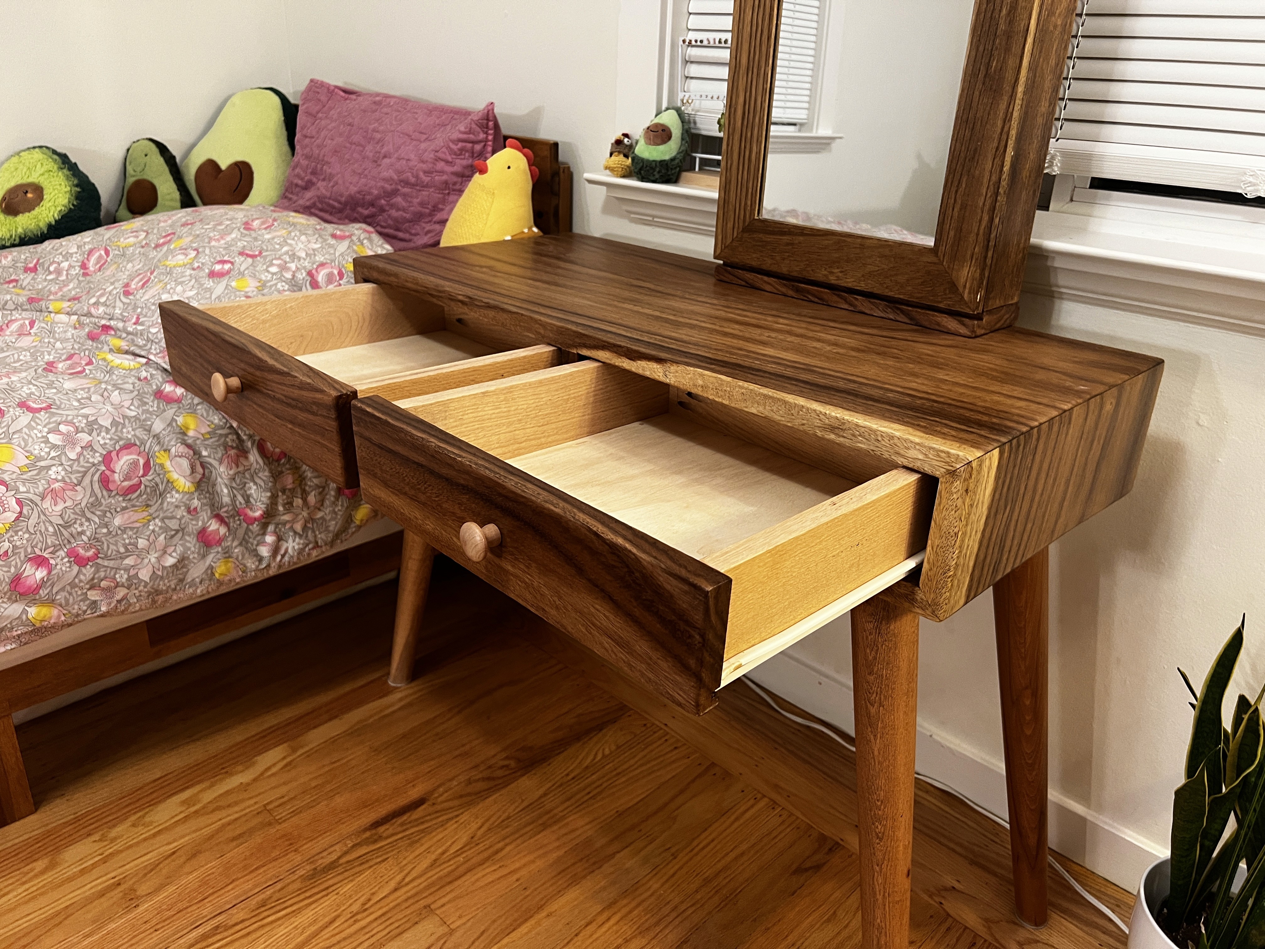 The slab was cut into 45-degree segments and folded into a wraparound box — the same waterfall technique that lets the grain travel around corners as though the wood were never cut at all. Enough material remained from the slab to yield matching drawer fronts, keeping the whole piece visually consistent. The cabinet and legs came separately and were refinished to complement the cocobolo rather than clash with it. The result was striking — but if we're being honest, the only thing that really mattered was that she liked it.