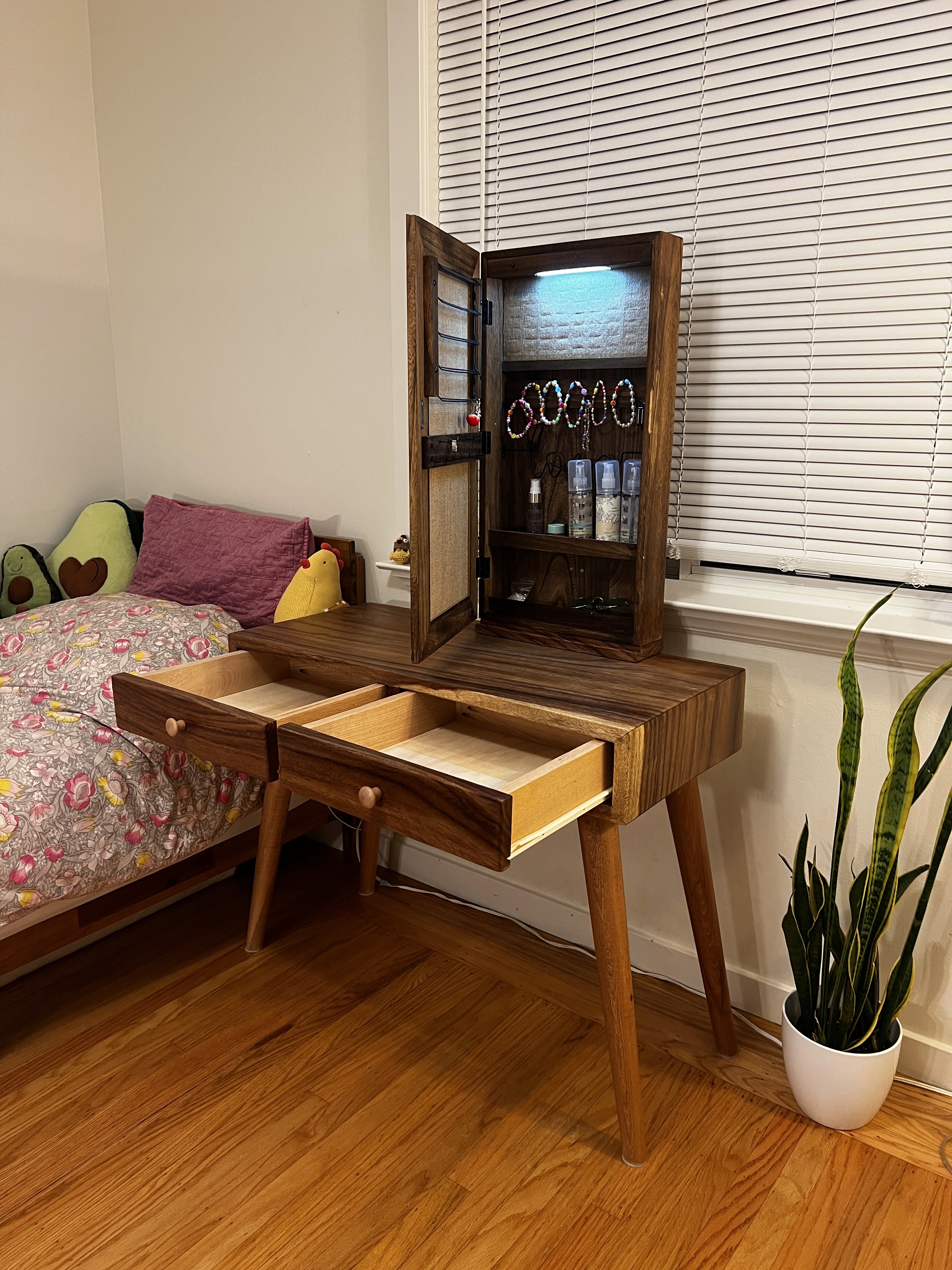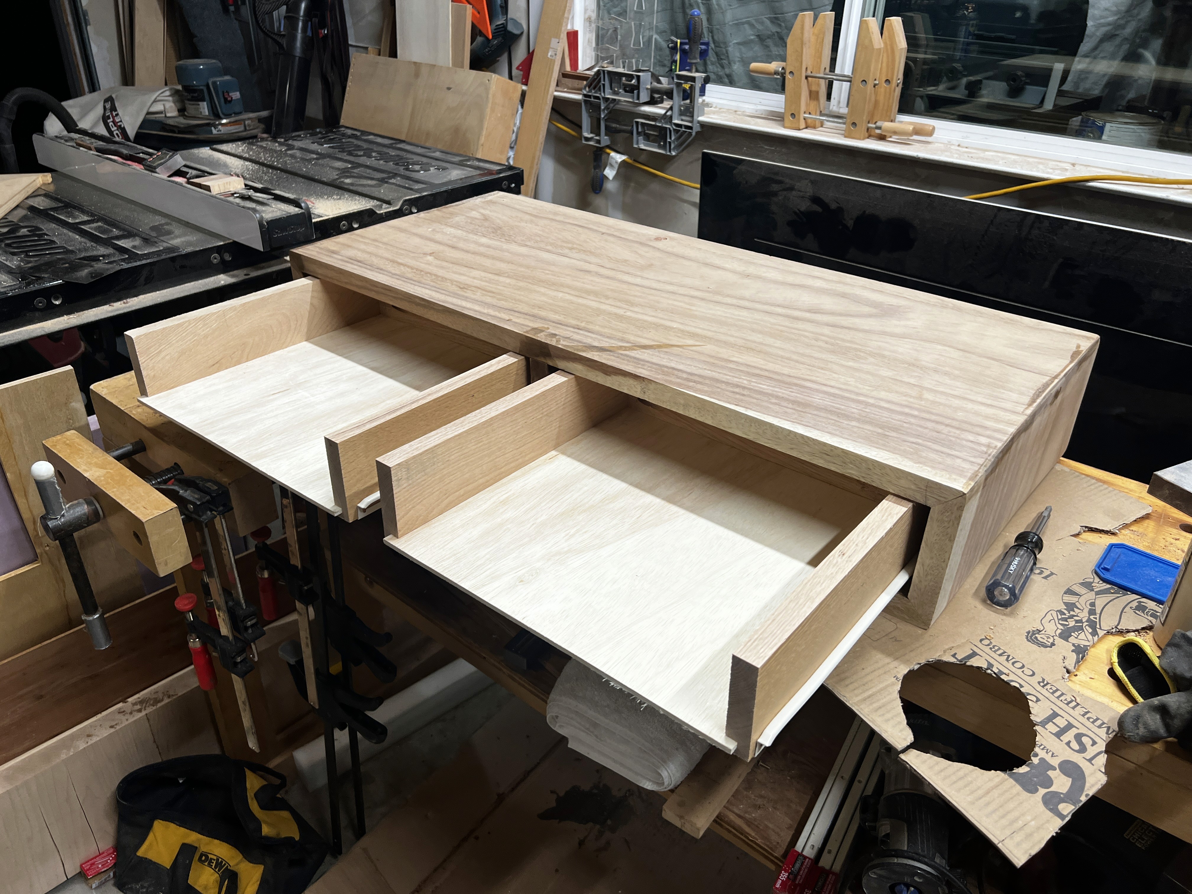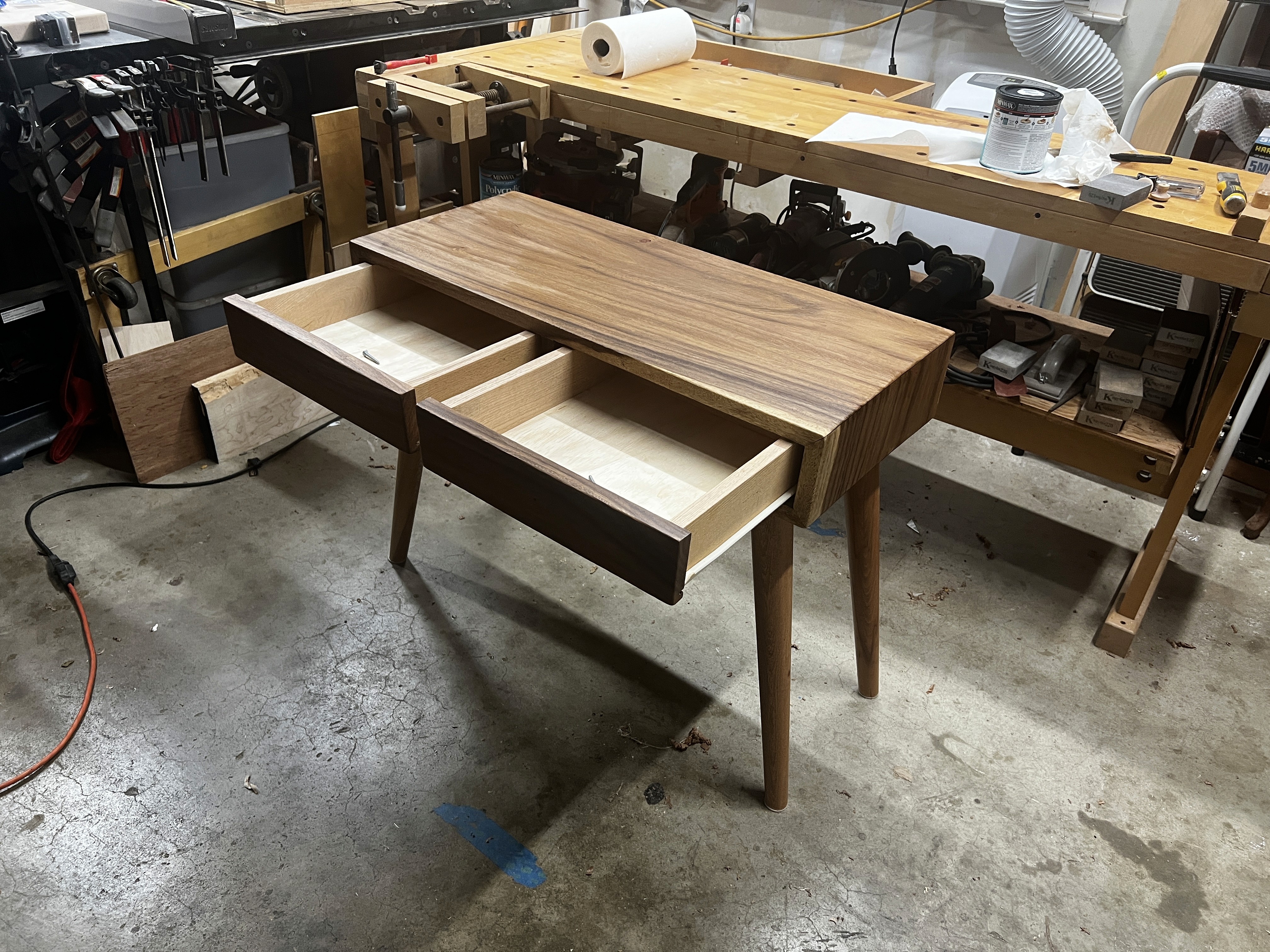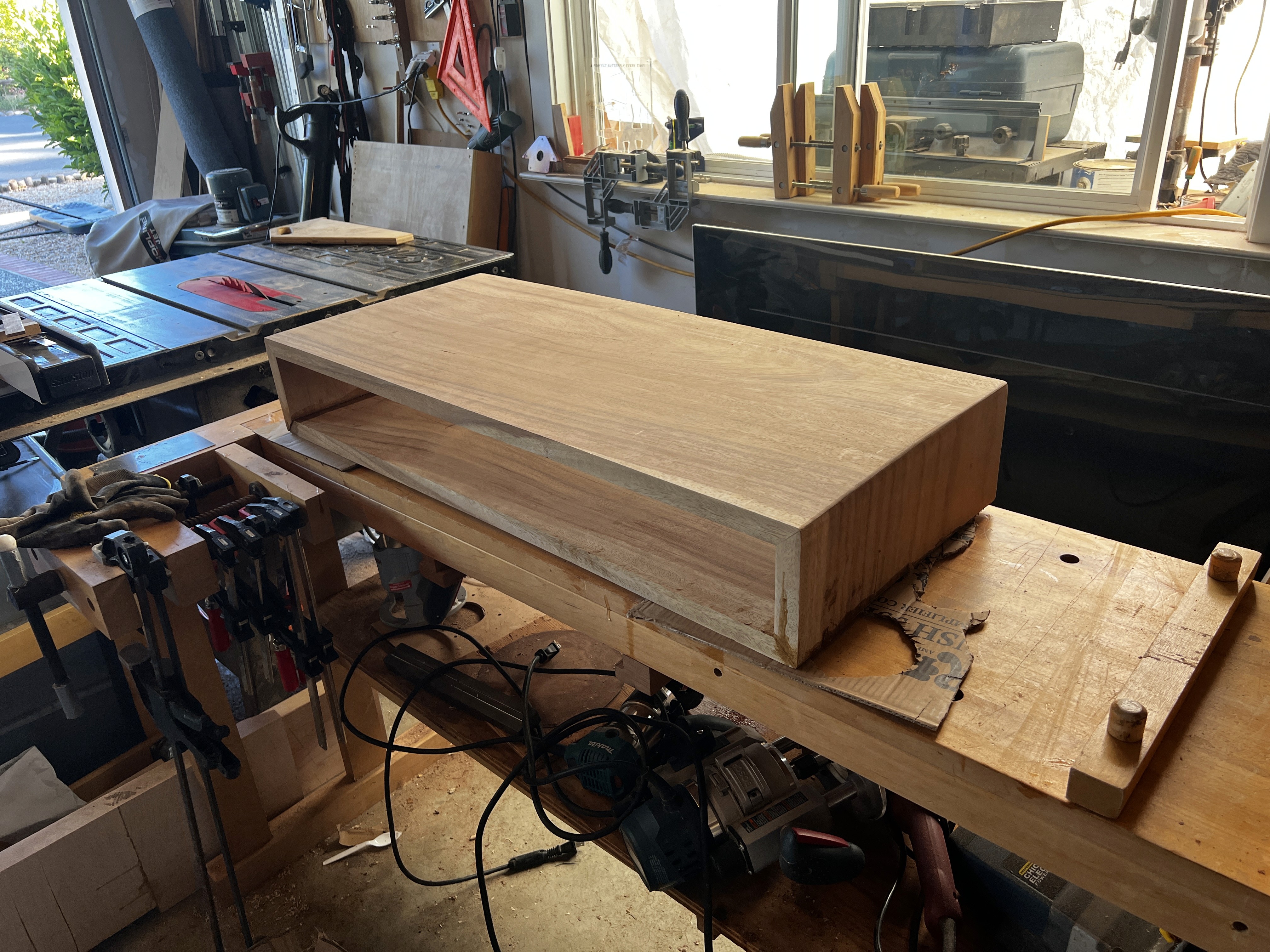 The slab was cut into 45-degree segments and folded into a wraparound box — the same waterfall technique that lets the grain travel around corners as though the wood were never cut at all. Enough material remained from the slab to yield matching drawer fronts, keeping the whole piece visually consistent. The cabinet and legs came separately and were refinished to complement the cocobolo rather than clash with it. The result was striking — but if we're being honest, the only thing that really mattered was that she liked it.