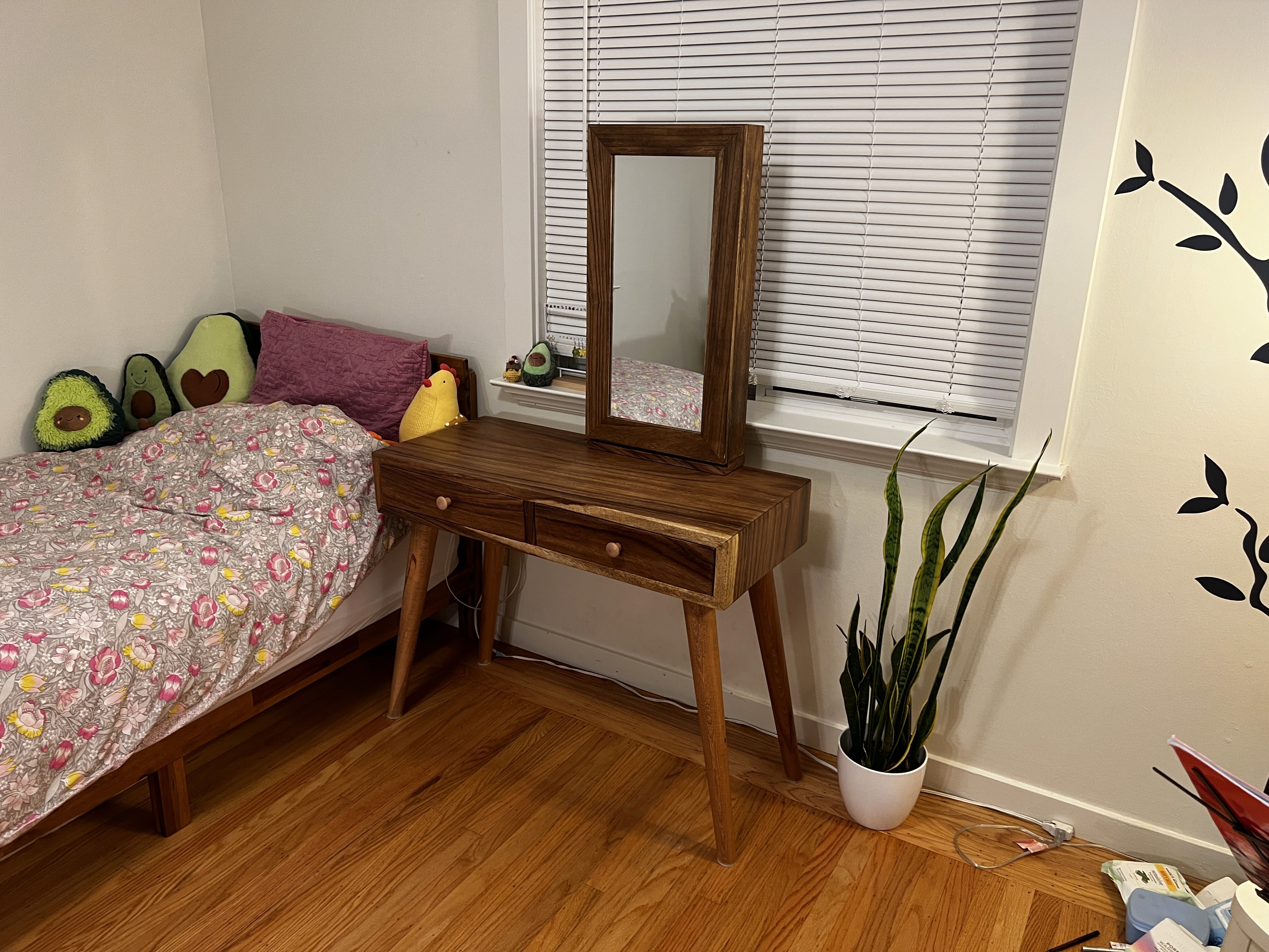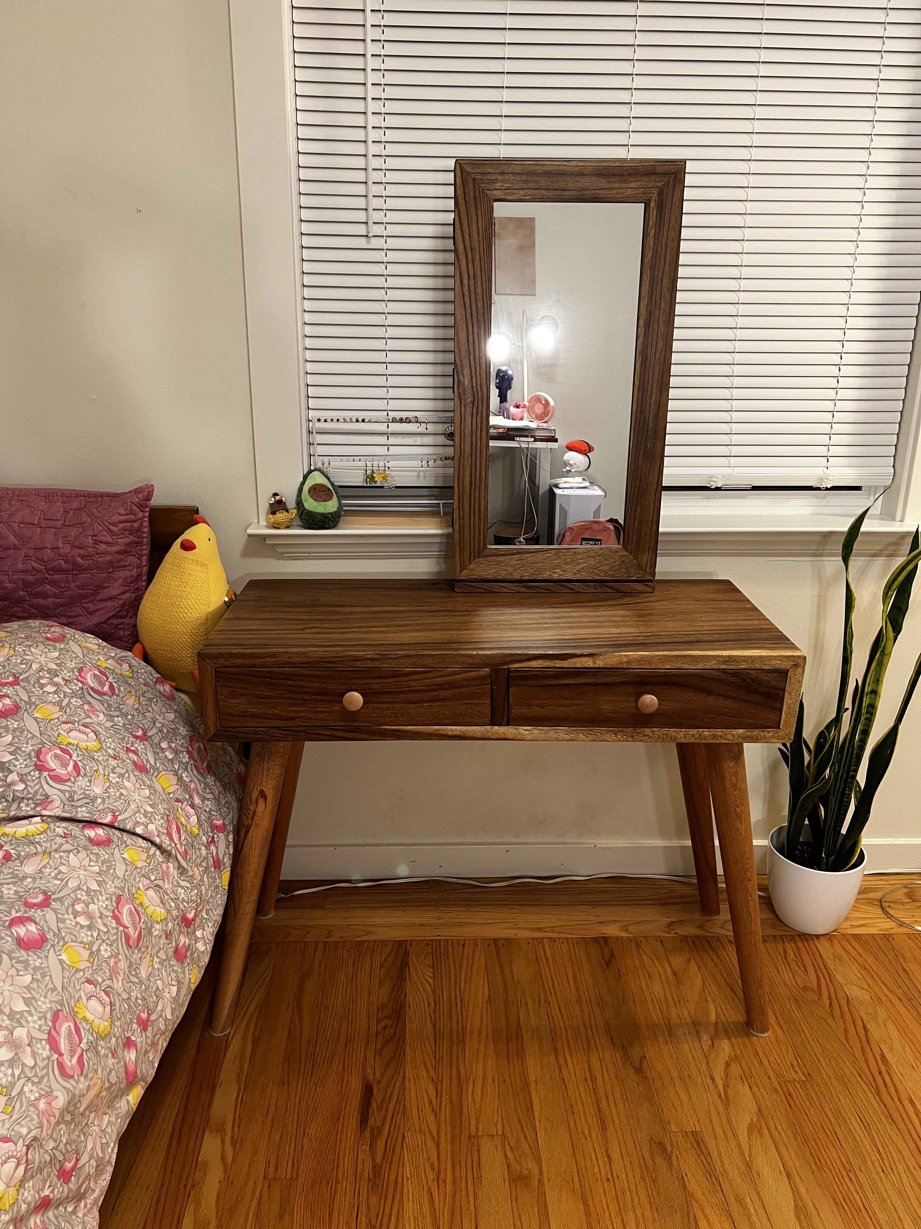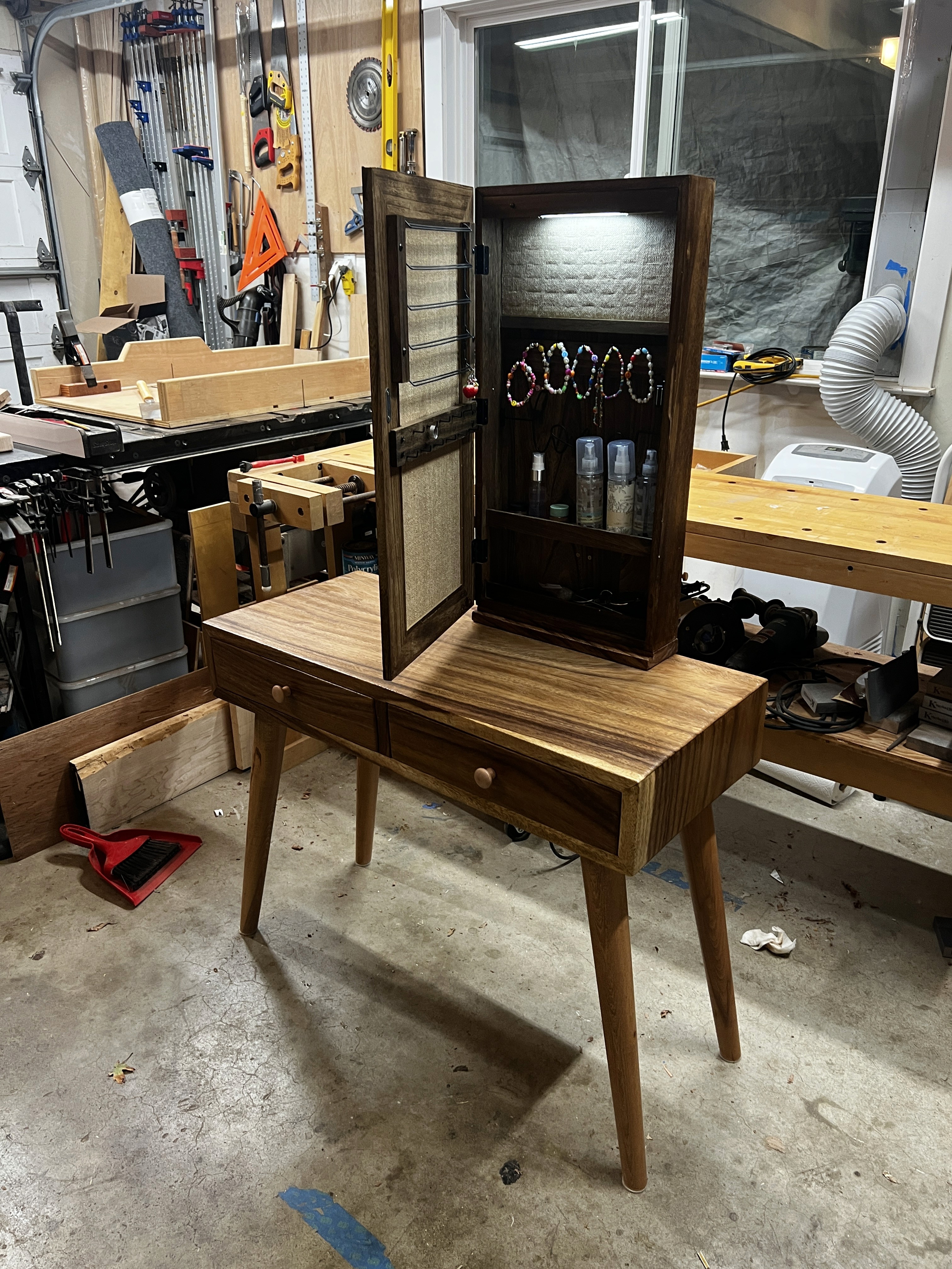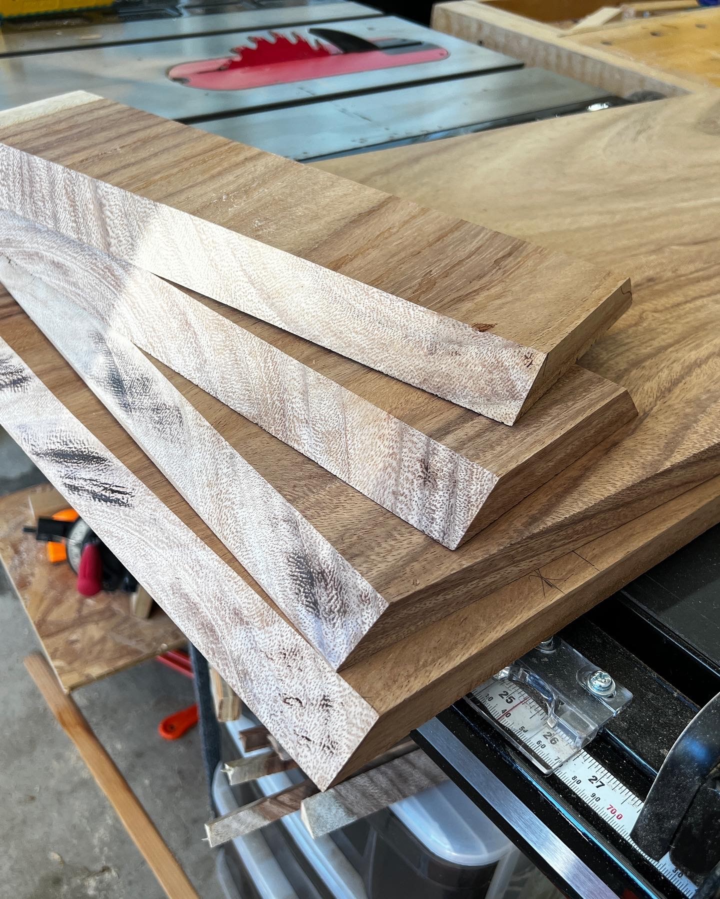 The slab was cut into 45-degree segments and folded into a wraparound box — the same waterfall technique that lets the grain travel around corners as though the wood were never cut at all. Enough material remained from the slab to yield matching drawer fronts, keeping the whole piece visually consistent. The cabinet and legs came separately and were refinished to complement the cocobolo rather than clash with it. The result was striking — but if we're being honest, the only thing that really mattered was that she liked it.