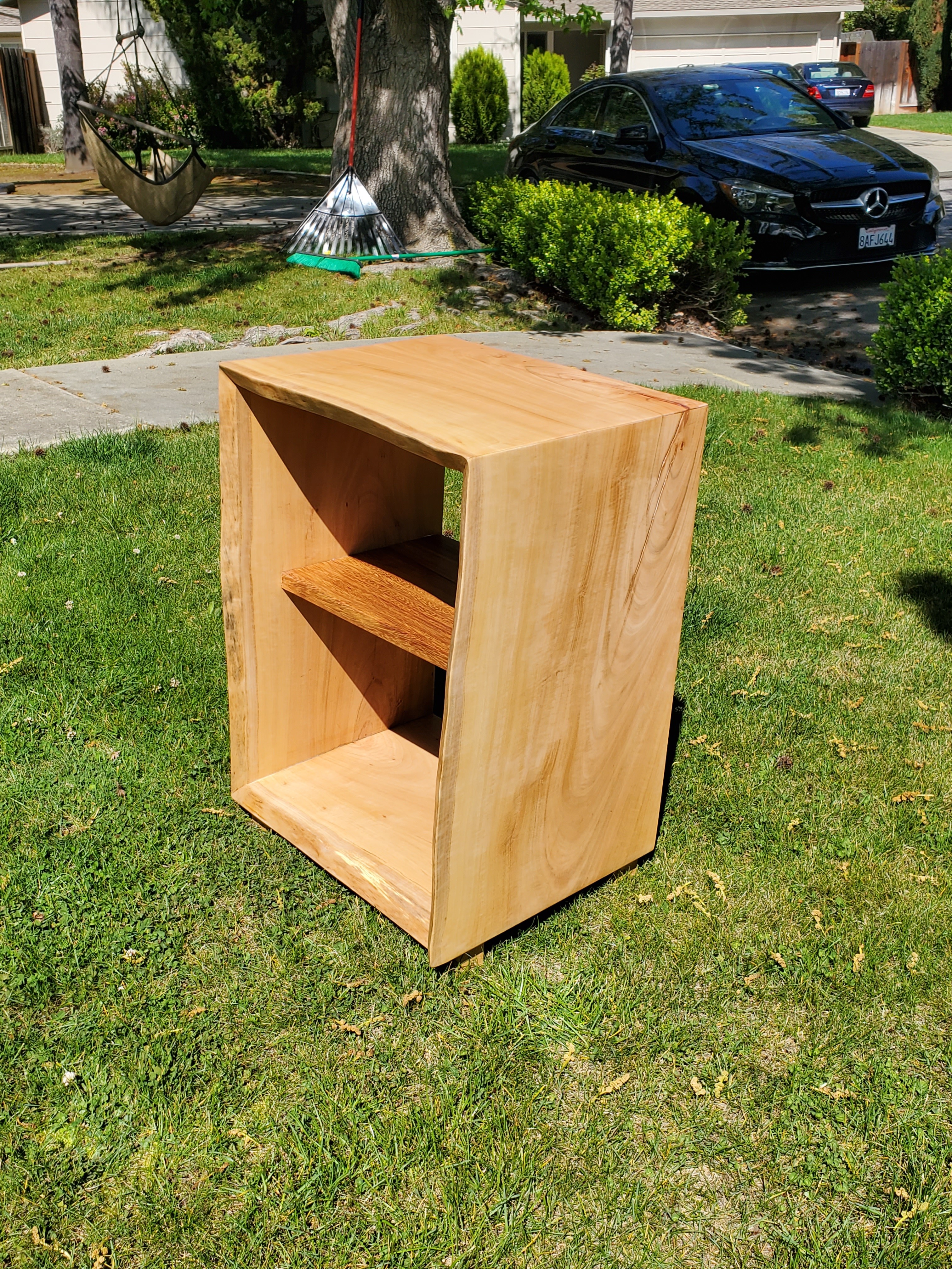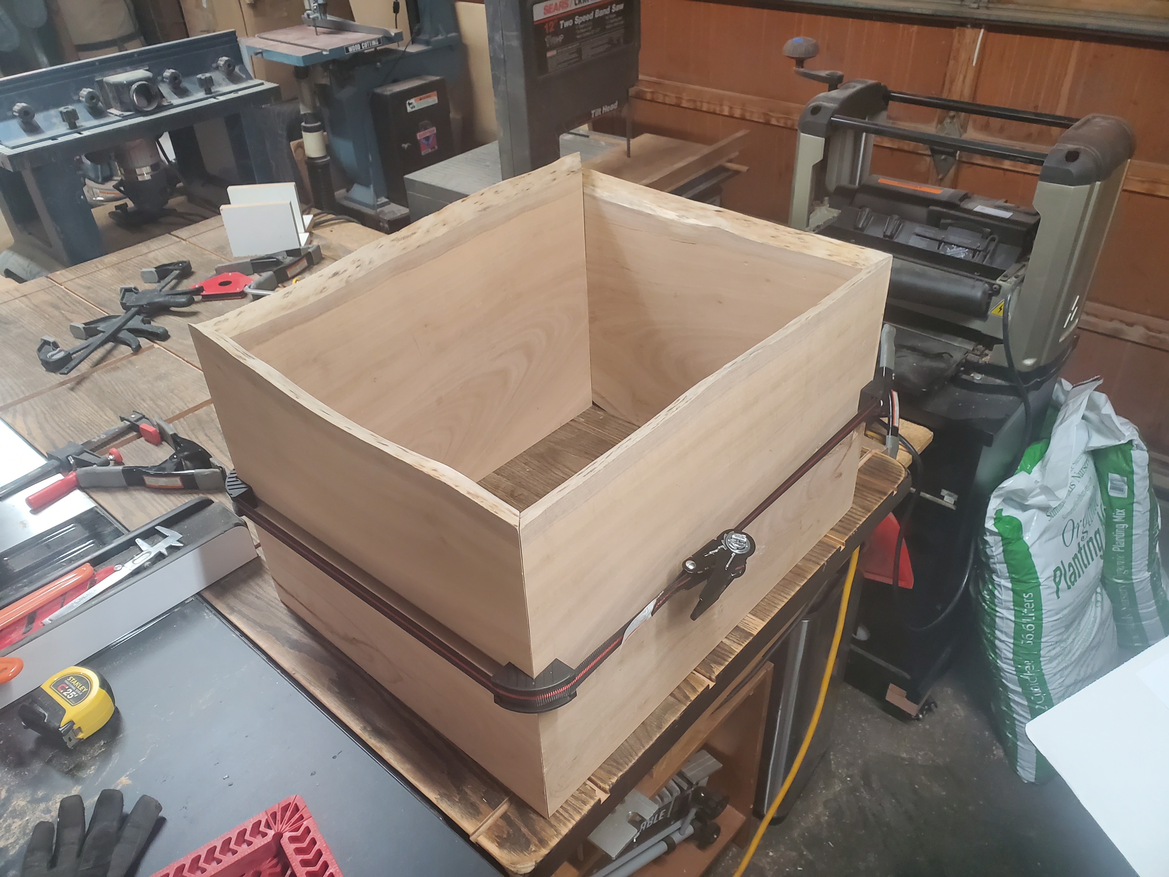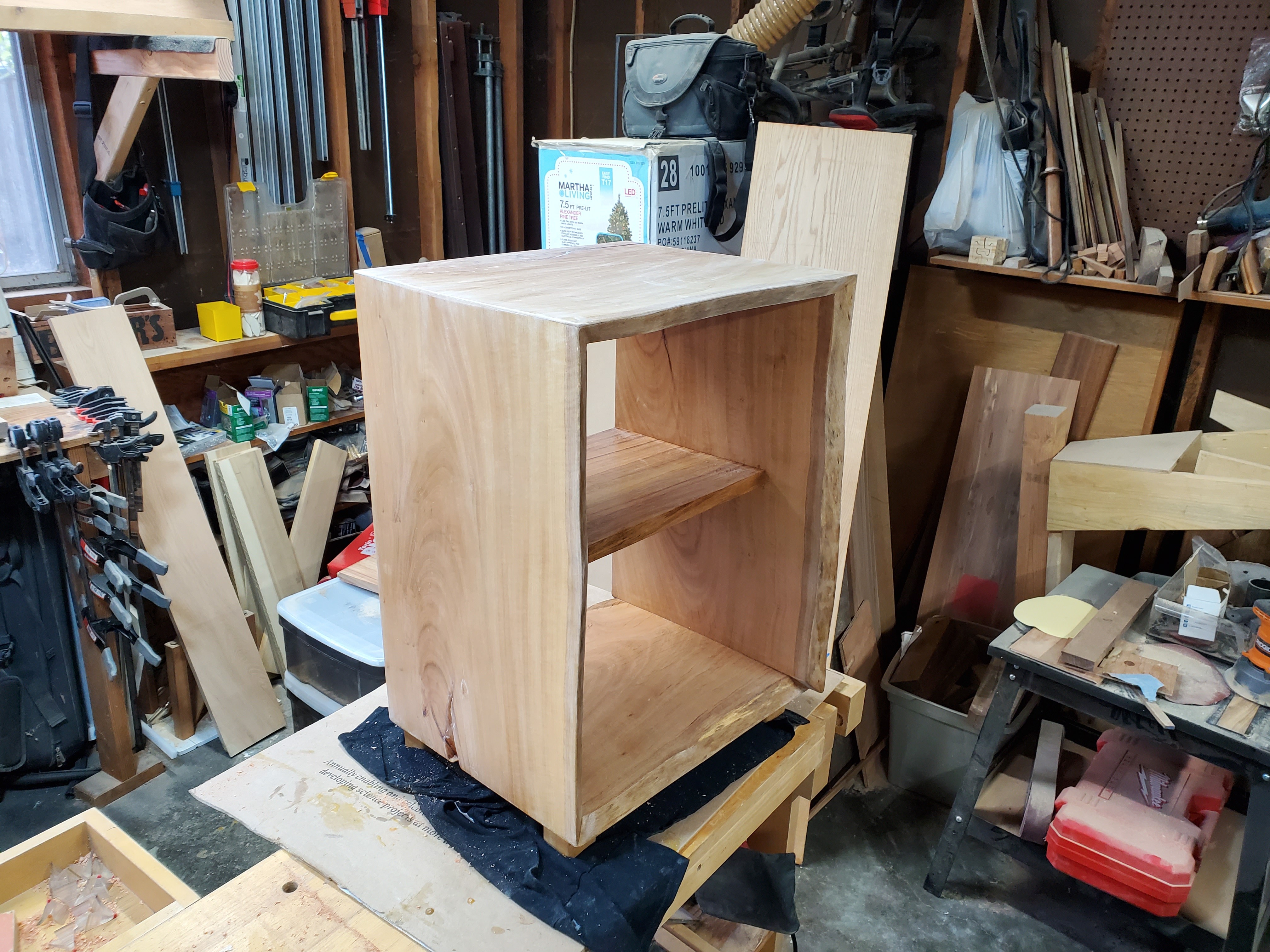 The 45-degree cuts are the easy part. The challenge is folding the slab up, then gluing and clamping it while coaxing every corner into a perfect 90 degrees before it sets. But once that box is locked in, the rest follows naturally — and the result is as solid and heavy as bedside tables get.