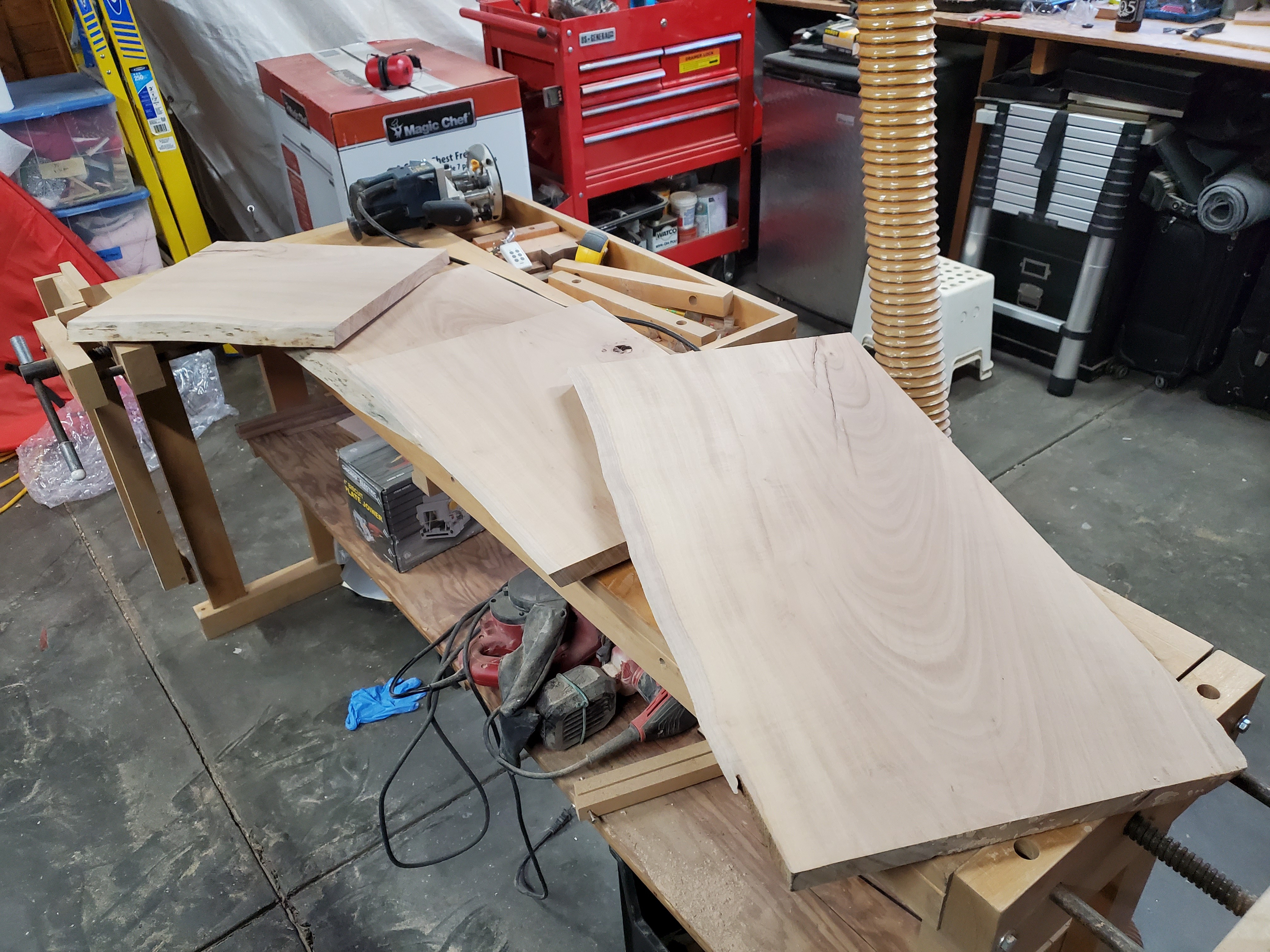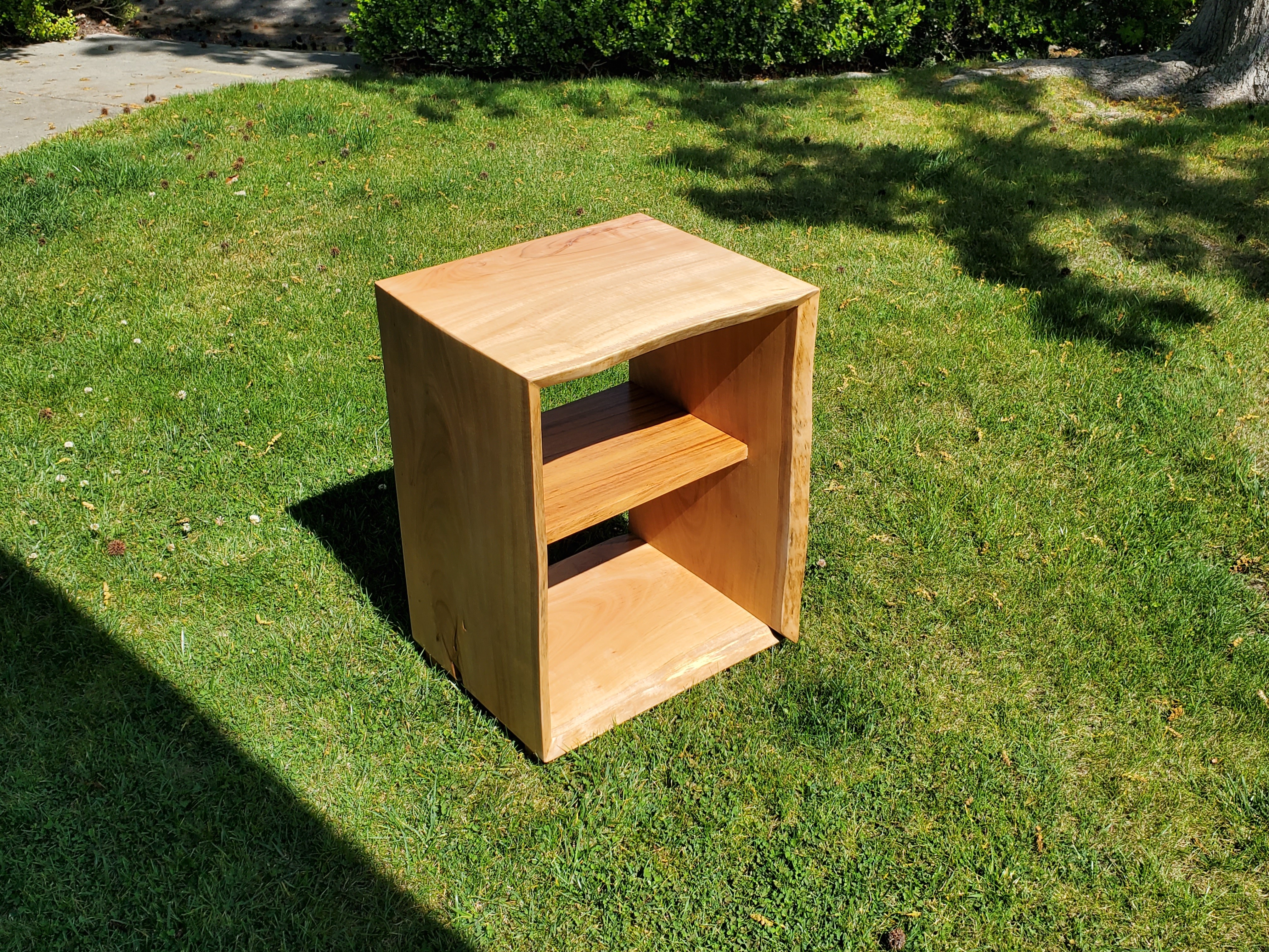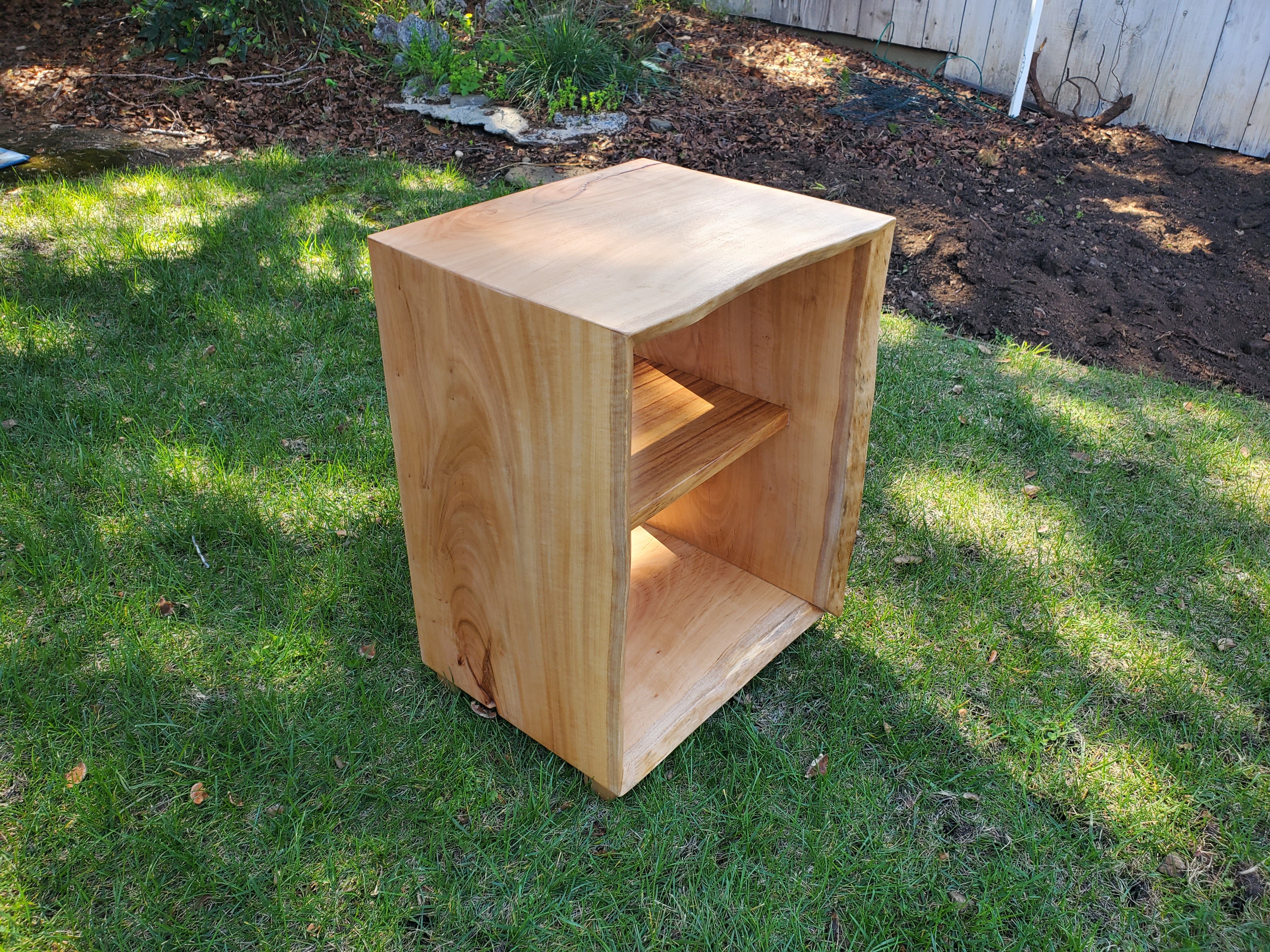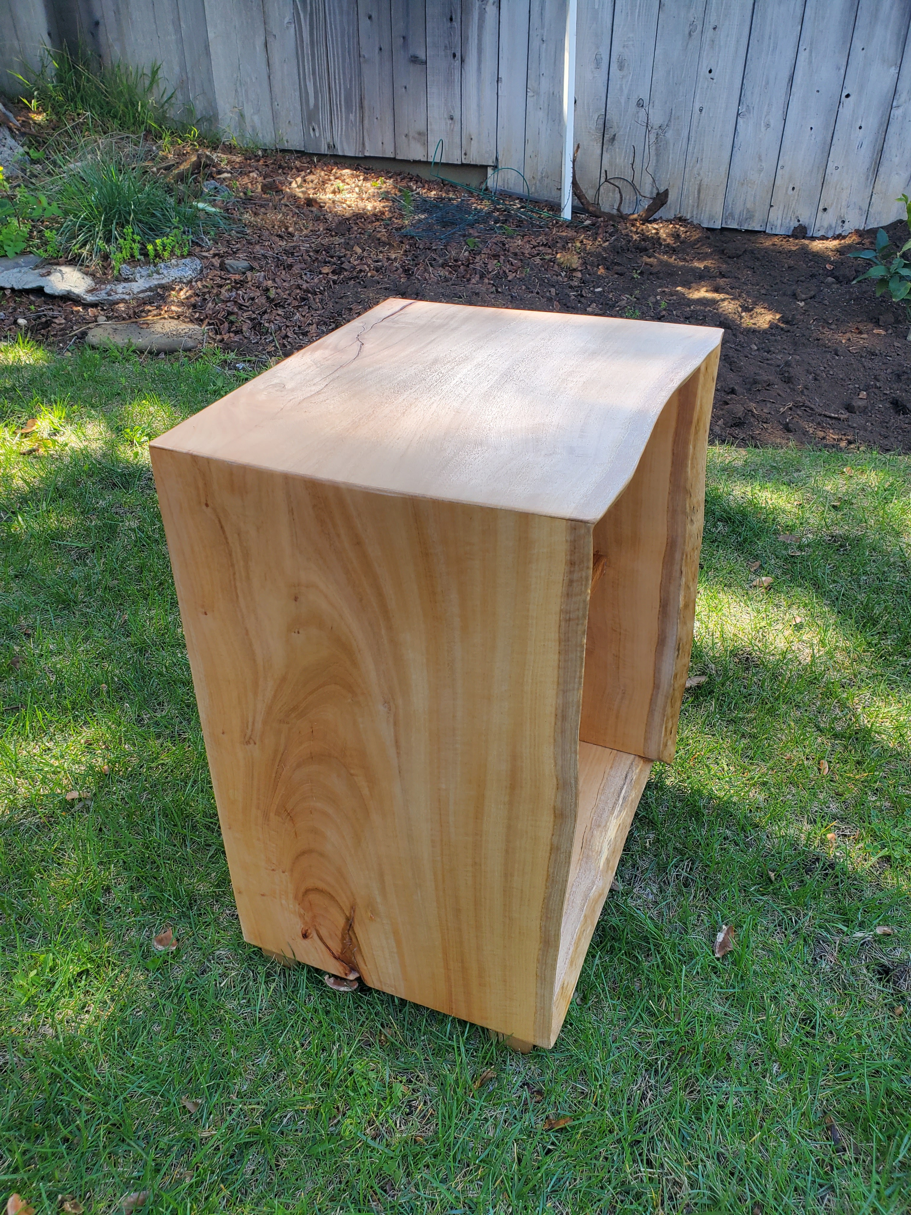 The 45-degree cuts are the easy part. The challenge is folding the slab up, then gluing and clamping it while coaxing every corner into a perfect 90 degrees before it sets. But once that box is locked in, the rest follows naturally — and the result is as solid and heavy as bedside tables get.
