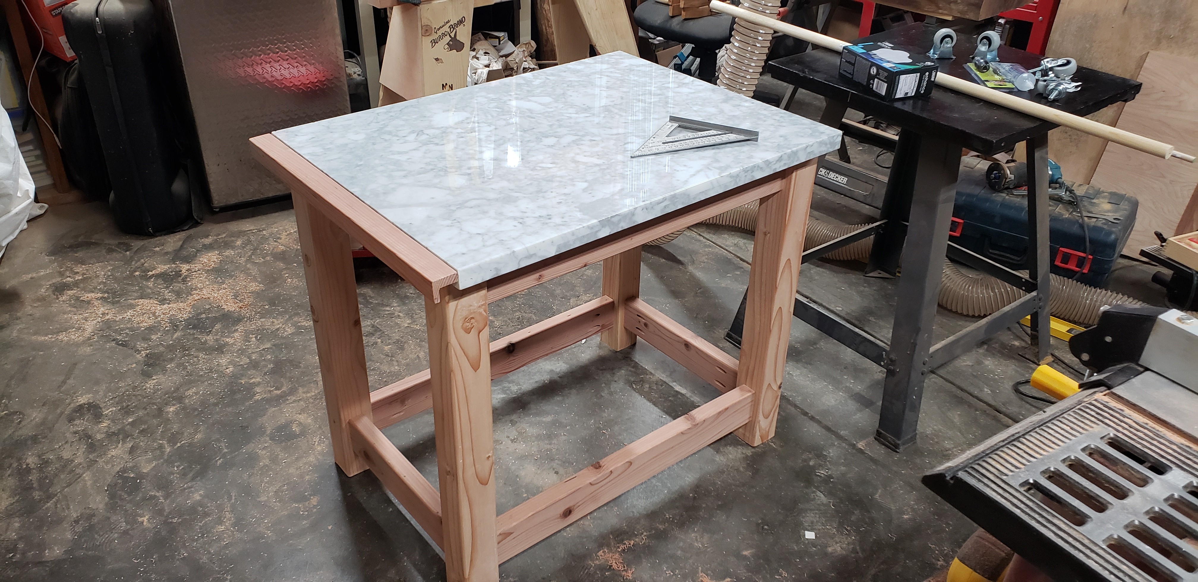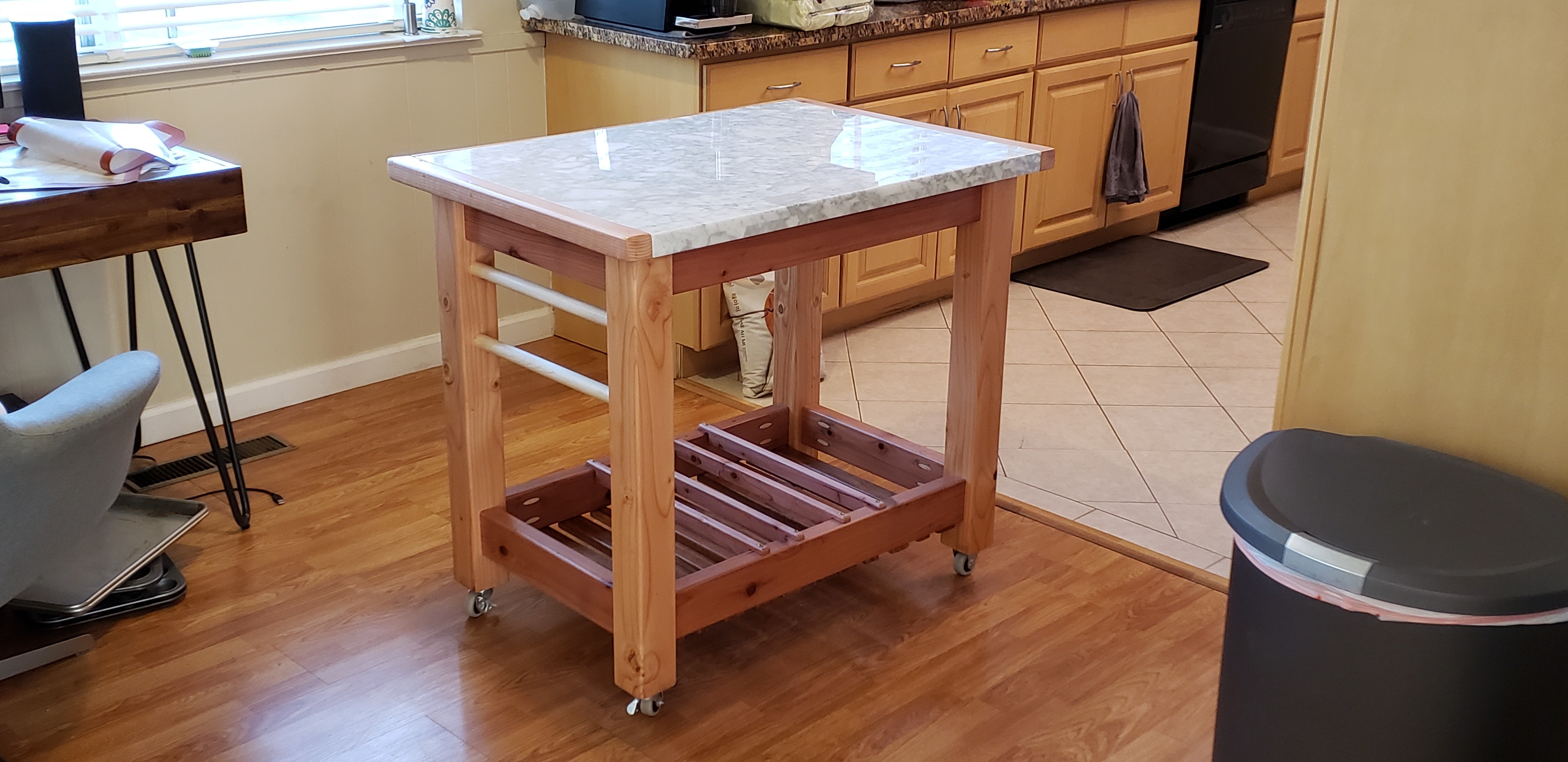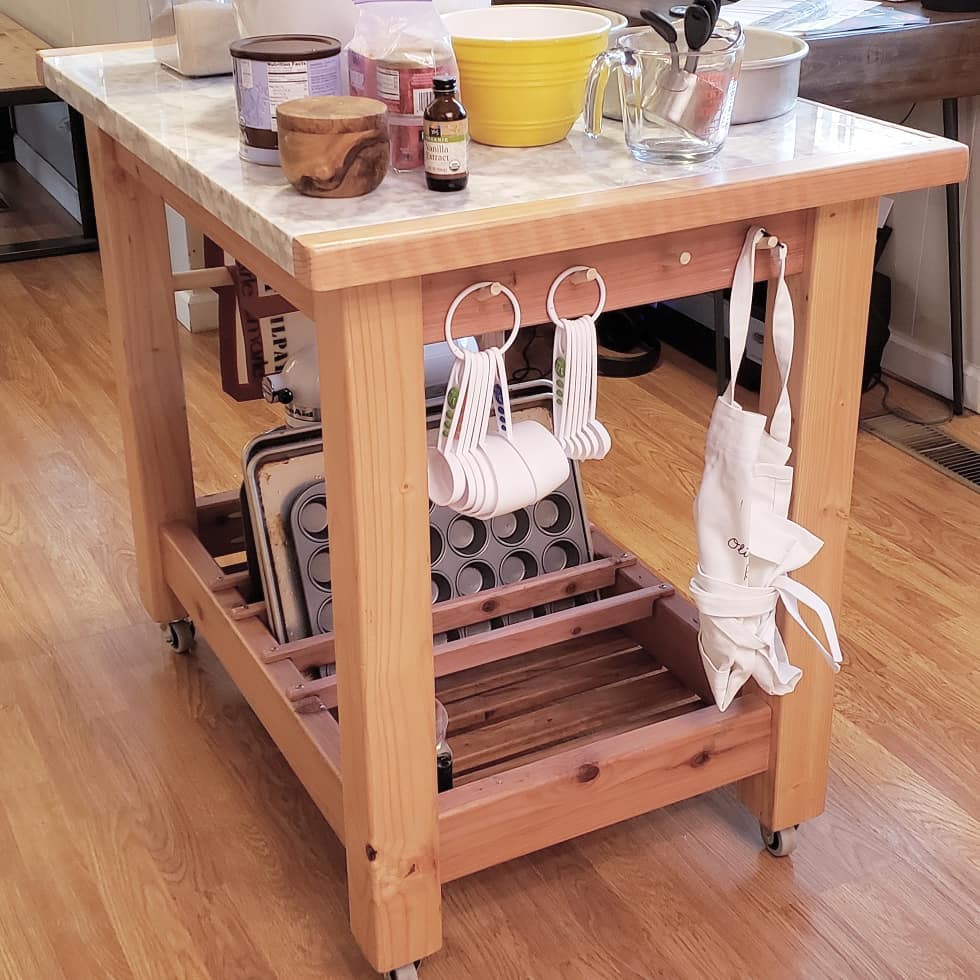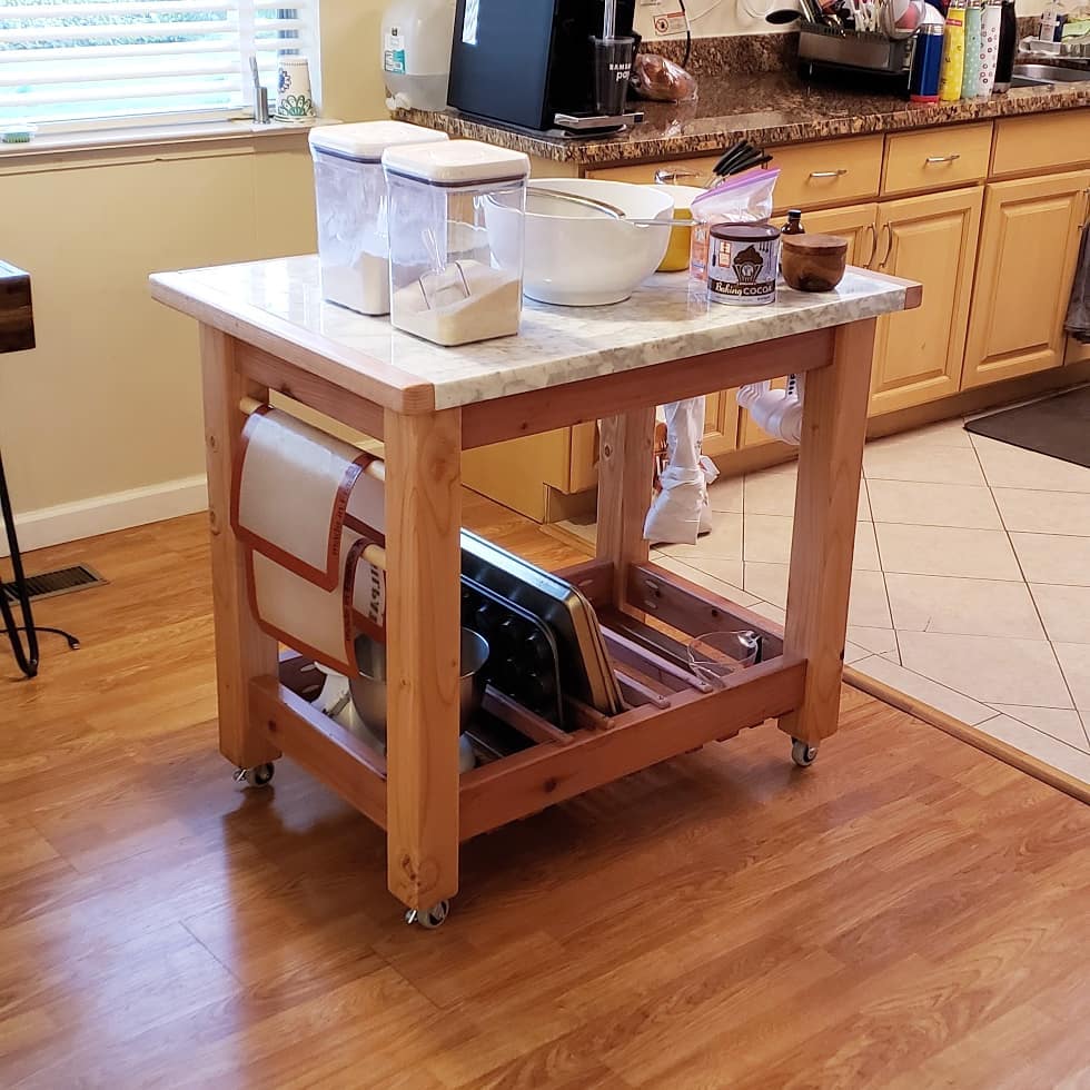 he marble slab came as it was — perfect in size for serious baking, but rough-cut on three edges. That dictated everything: the dimensions, the framing, and the decision to border three sides with half-lapped wood to give it a finished edge. From there the base came together cleanly with pocket holes and finish screws, and lockable wheels mean it can roll freely or lock in place — useful, since the owner ended up using it as a center island just as often as a baking station.