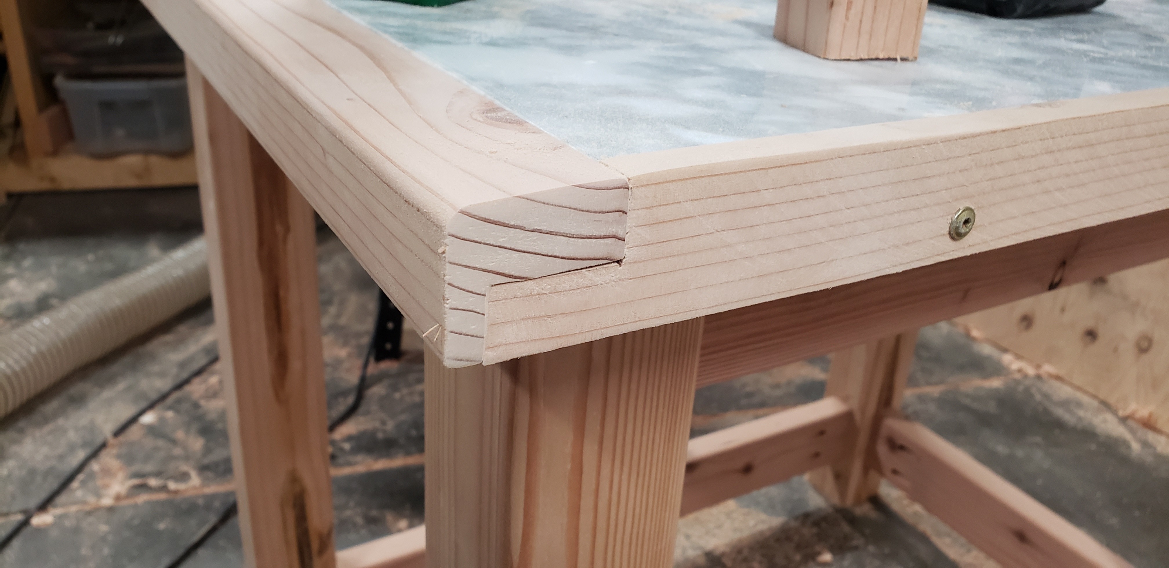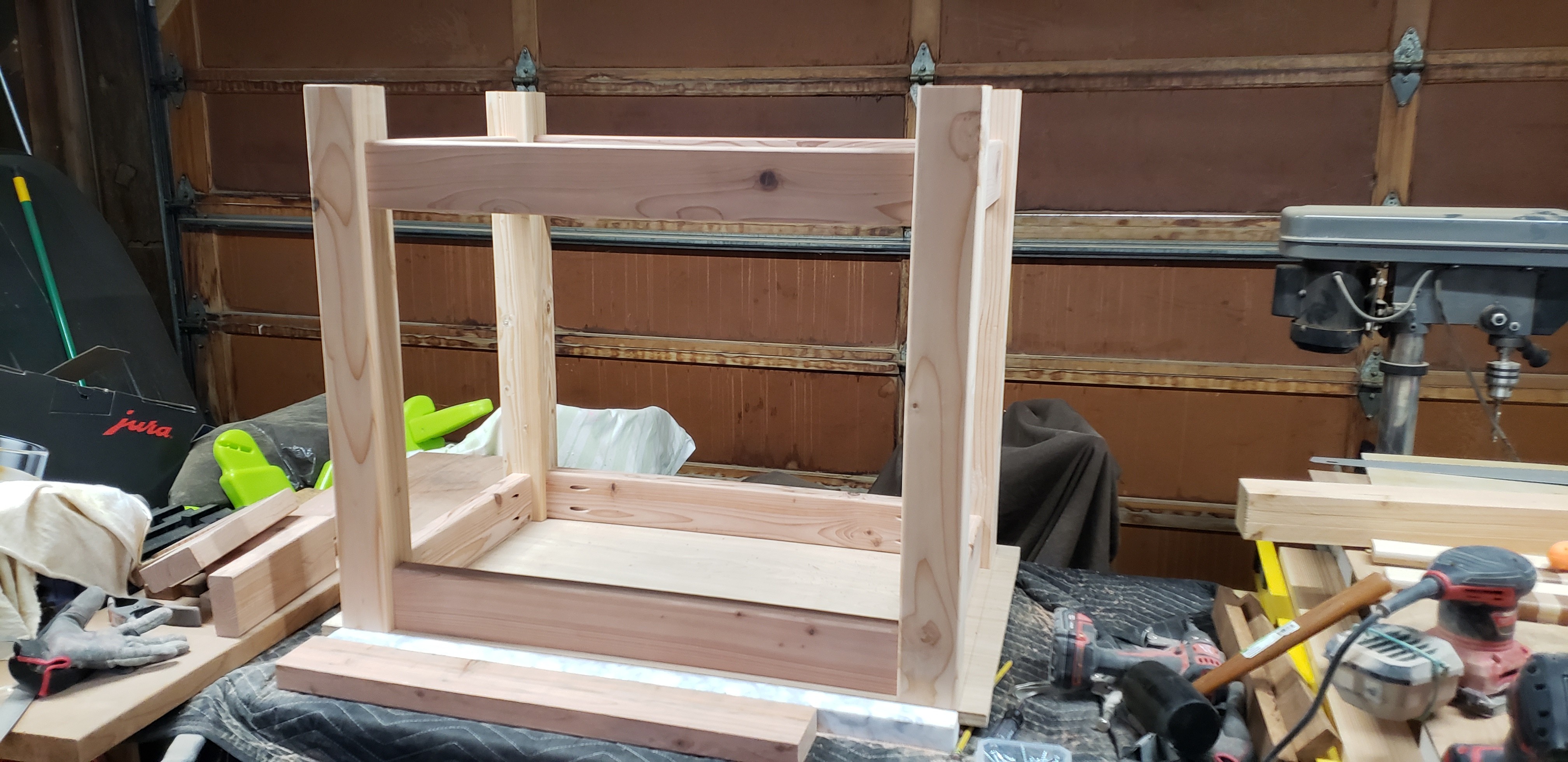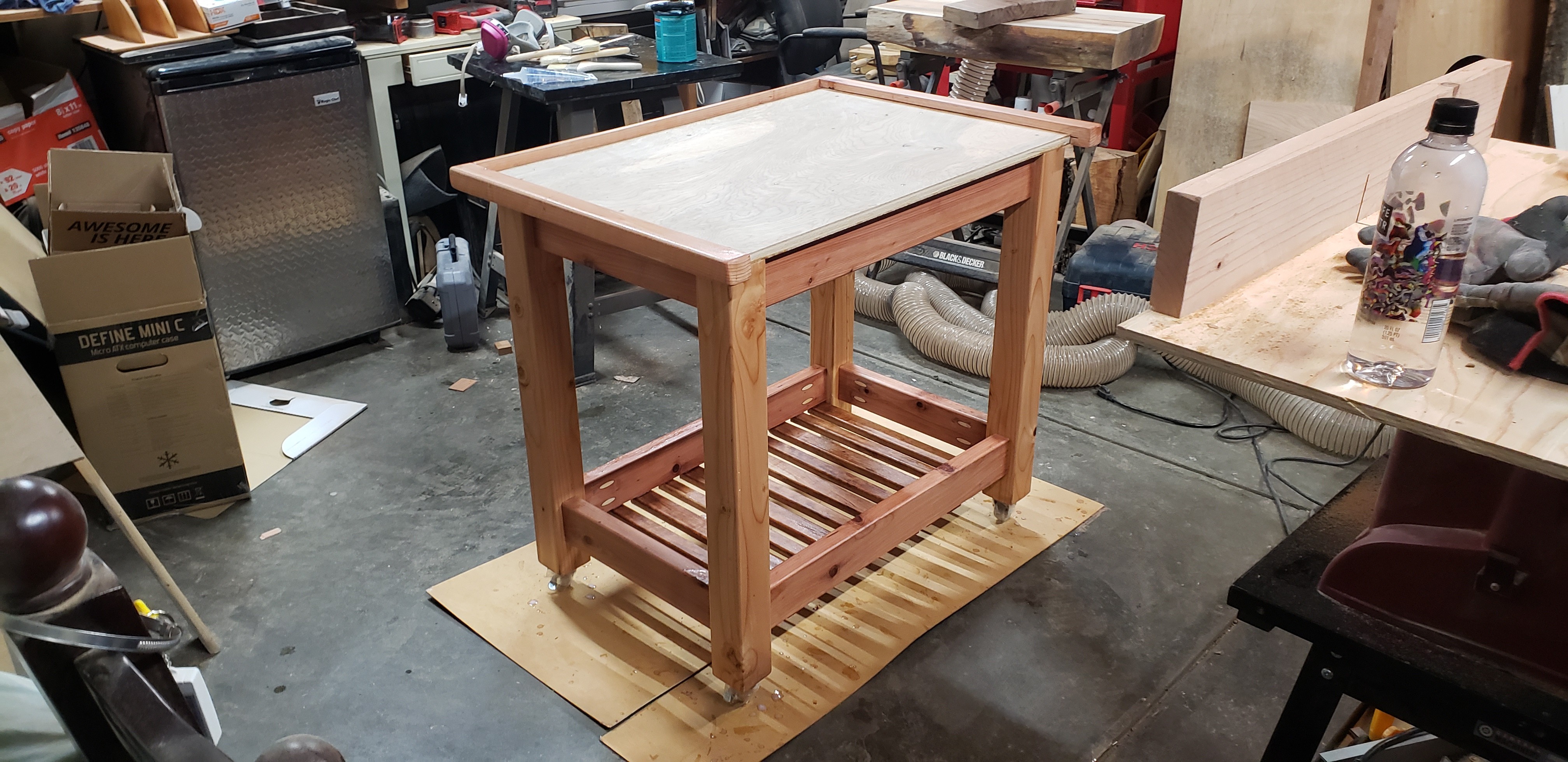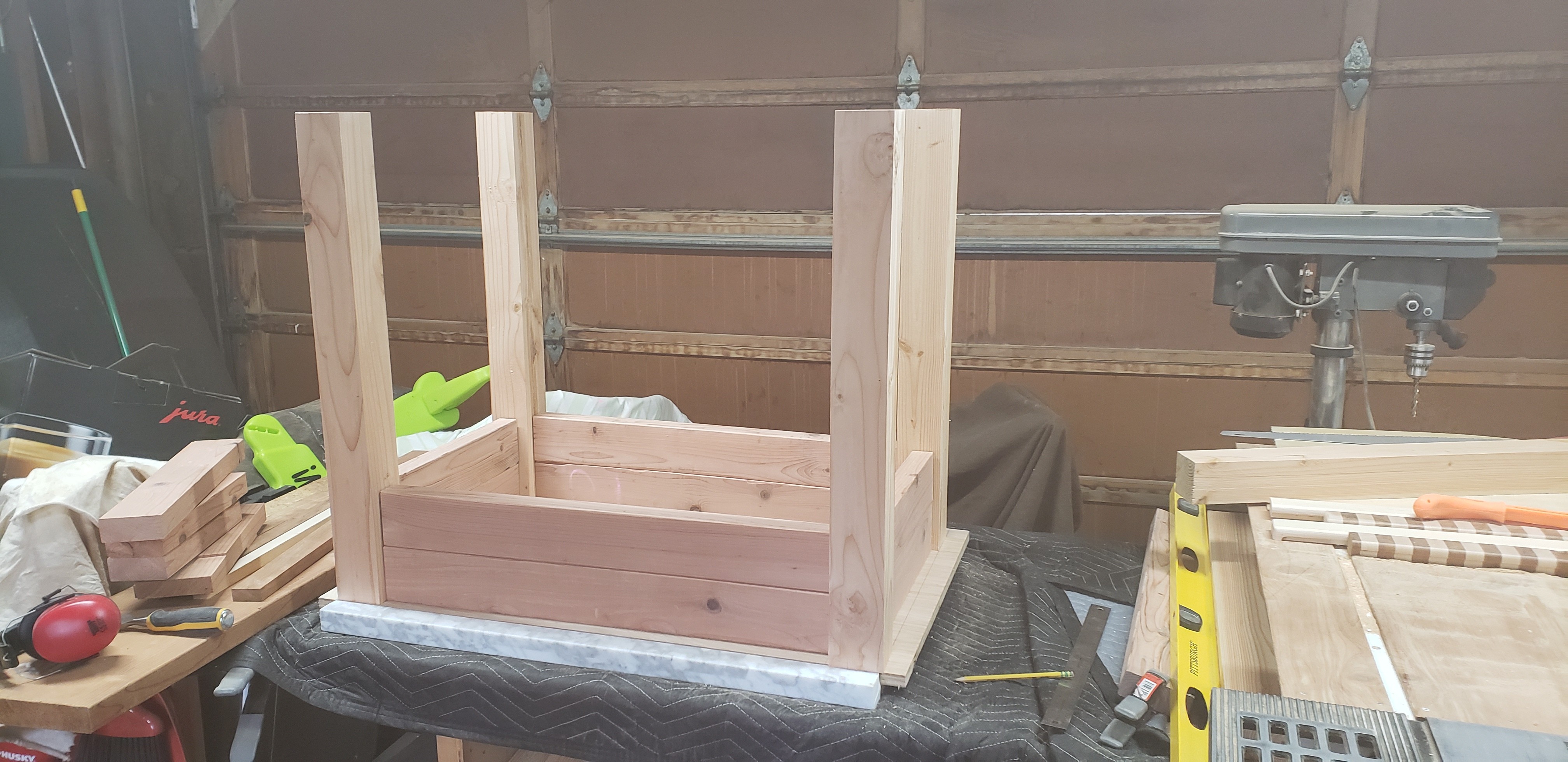 he marble slab came as it was — perfect in size for serious baking, but rough-cut on three edges. That dictated everything: the dimensions, the framing, and the decision to border three sides with half-lapped wood to give it a finished edge. From there the base came together cleanly with pocket holes and finish screws, and lockable wheels mean it can roll freely or lock in place — useful, since the owner ended up using it as a center island just as often as a baking station.